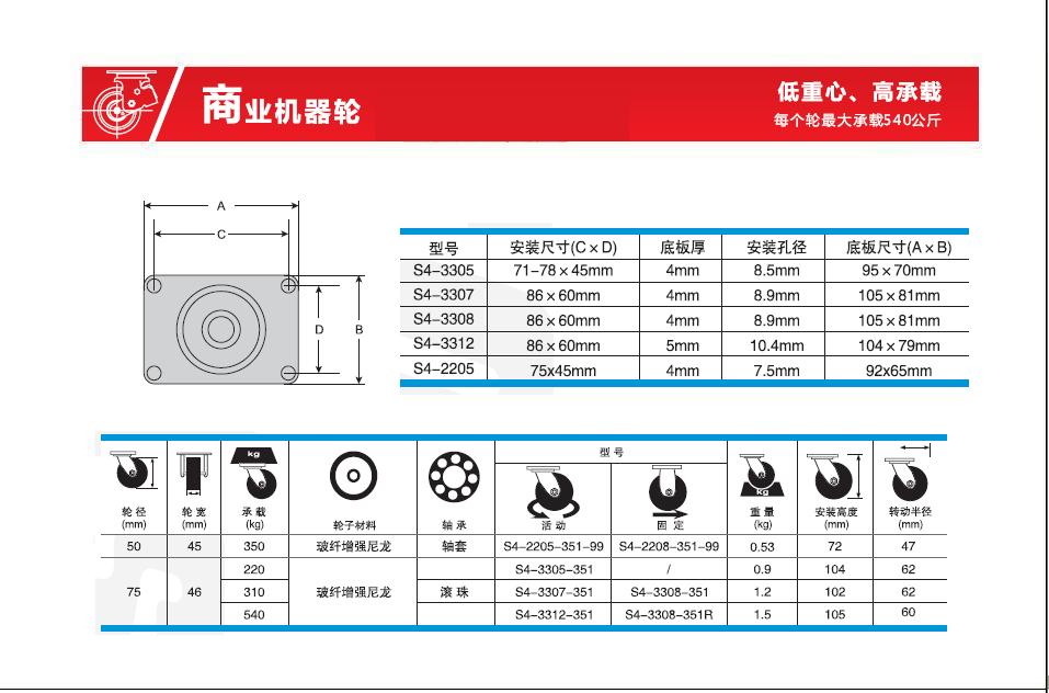 類    型: 低重心腳輪(80-540Kg)